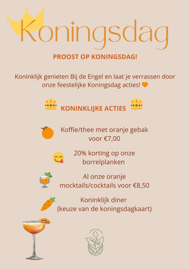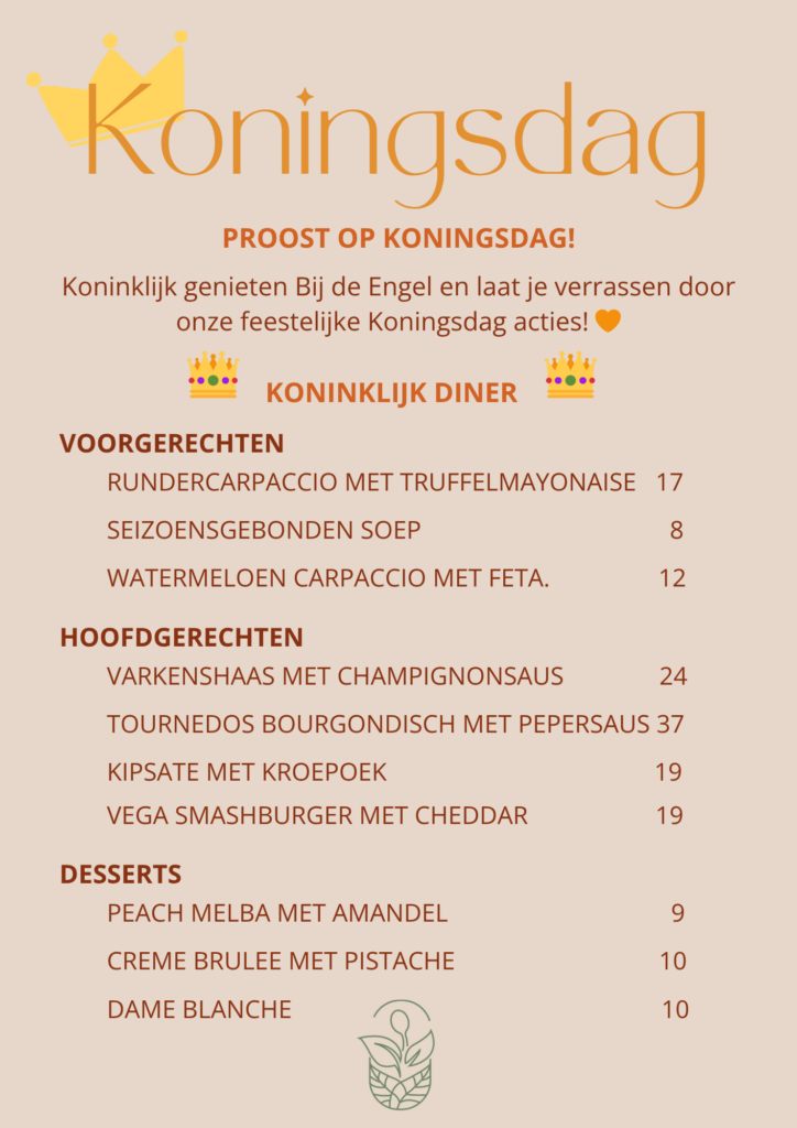 Kom je gezellig proosten op de koning op koningsdag? Geniet deze dag van een van onze leuke koningsdag acties, en een heerlijk koninklijk diner!