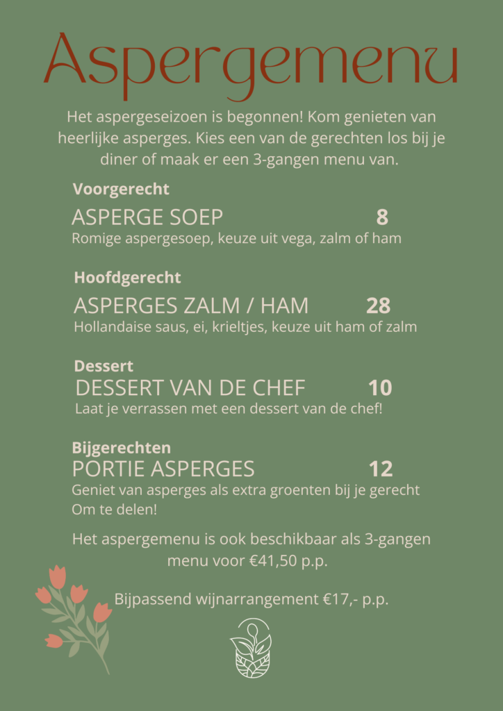 Kom genieten van ons heerlijke aspergemenu met klassieke asperge gerechten. Kies een van de opties als los gerecht, of maak er een 3-gangen menu van. ✨